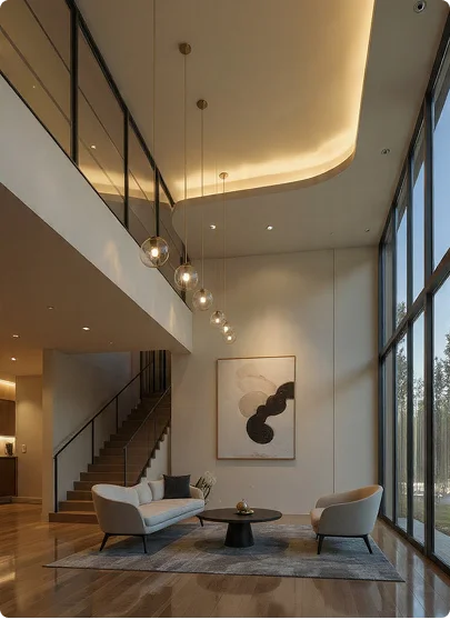 A modern home interior design focused on warm lighting, minimalistic elements, open space planning, and refined details to elevate everyday living.